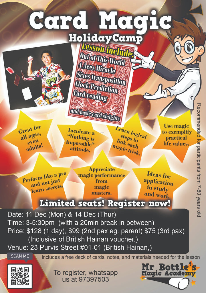 Fascinated by magicians and wish you knew how to perform too? Conducted by popular kids magician, Mr Bottles, little ones (and parents too) can join this fun Card Magic Holiday Camp to learn how to perform magic and wow at your next party!
