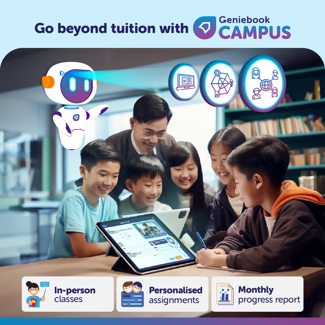 Our curriculum leverages Geniebook's AI-personalised engine, decades of teaching expertise, and an unmatched dataset of 300,000+ MOE-aligned questions. Together with collaborative group work and real-time teacher chats for consistent support outside of the classroom, your child has everything they need to reach their fullest potential.