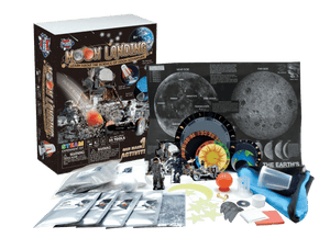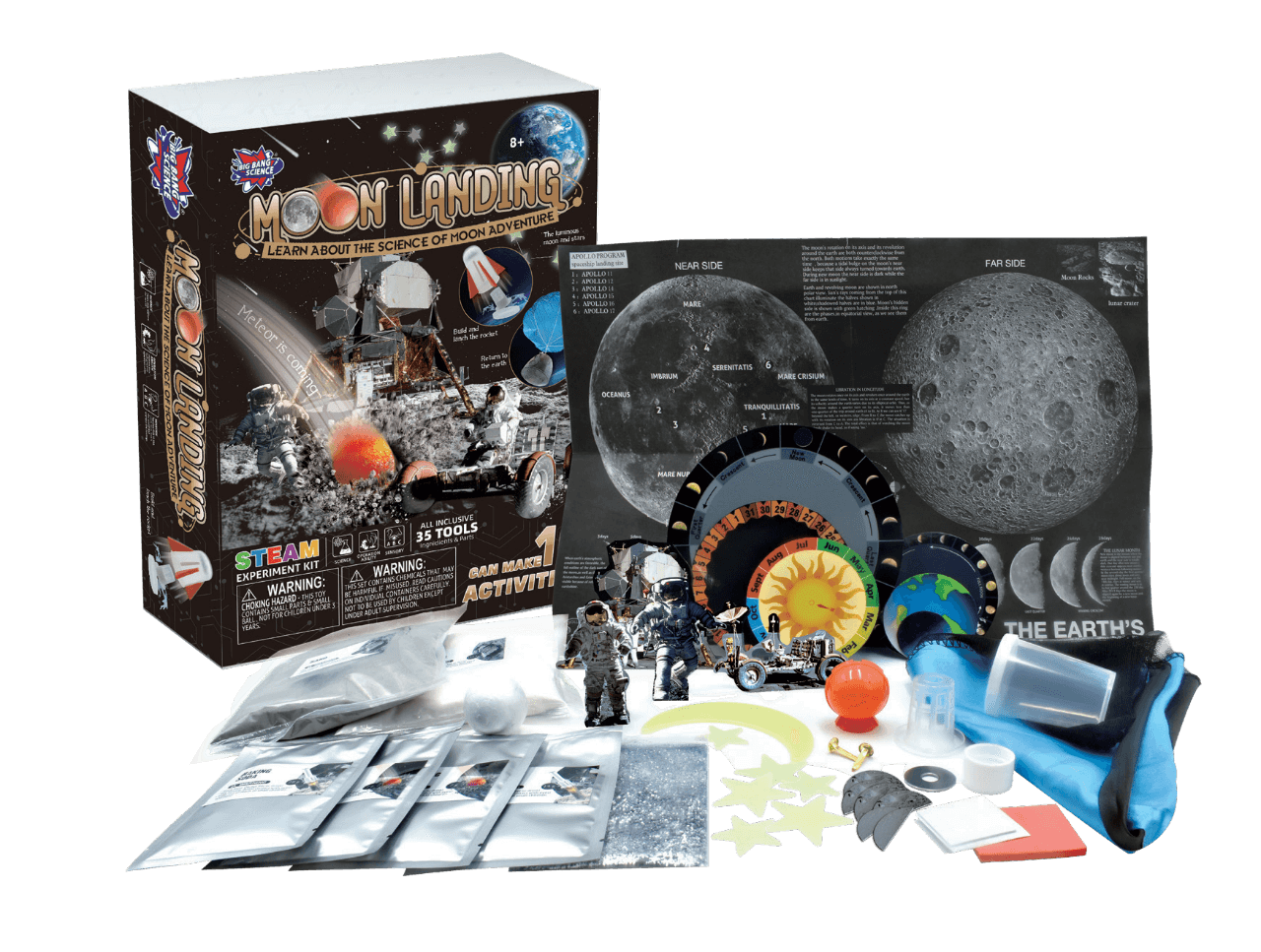Moon Landing STEAM Kit has 10 exciting and interesting activities including; build and launch rocket, return to earth, making lunar soil and many more!