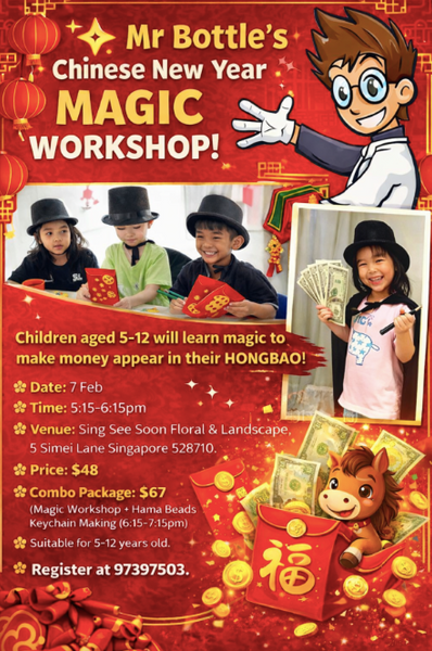 Be amazed at Mr Bottle's CNY Magic Workshop where they will learn fun magic tricks and discover how to multiply their mpney in an engaging 1-hour session for ages 5 to 12, or get creative at the Chinese New Year Keychain Craft Workshop, using Hama beads to design and make their own festive keychains.